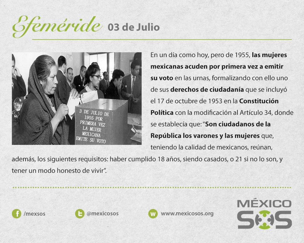 En un día como hoy, pero de 1955, las mujeres mexicanas acuden por primera vez a emitir su voto en las urnas, formalizando con ello uno de sus derechos de ciudadanía que se incluyó el 17 de octubre de 1953 en la Constitución Política con la modificación al Artículo 34, donde se establecía que: “Son ciudadanos de la República los varones y las mujeres que, teniendo la calidad de mexicanos, reúnan, además, los siguientes requisitos: haber cumplido 18 años, siendo casados, o 21 si no lo son, y tener un modo honesto de vivir”.